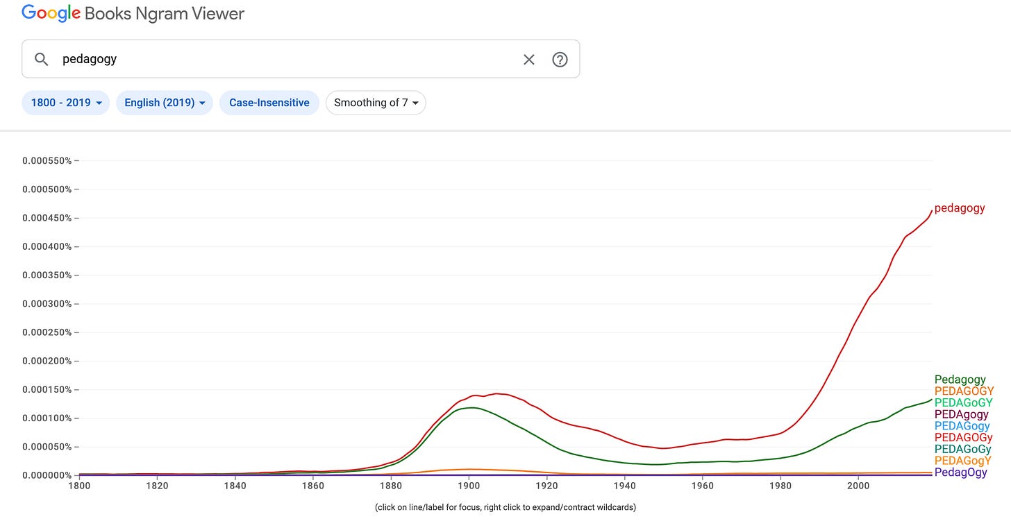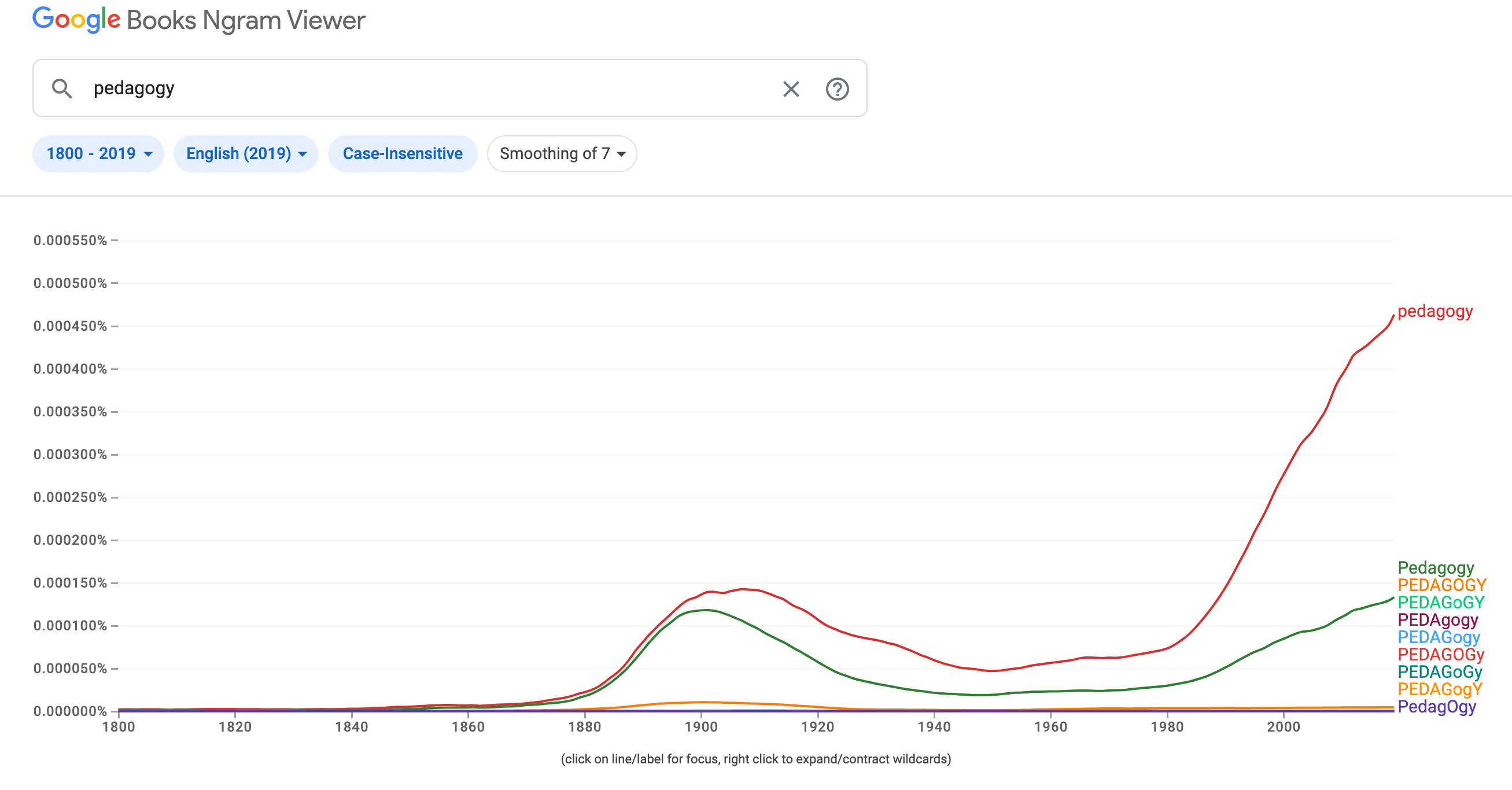 Back to Google: it seems the pronunciation problem didn’t exist until the bump in usage around the turn of the 20th century which coincides with the rise in compulsory school-based education, in what Hargreaves et al would call the “Anglophone Nations”. Then it seems to fall out of fashion, maybe mirroring the demise of progressive education in the post-war period, then takes off like a unicorn startup in the 80s, just as the Global Education Reform Movement (GERM) emerges - hmmm… interesting…