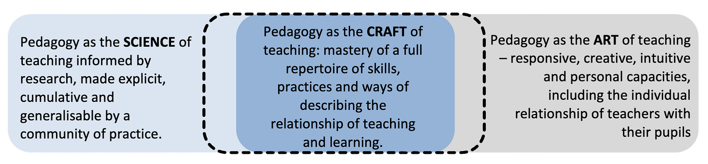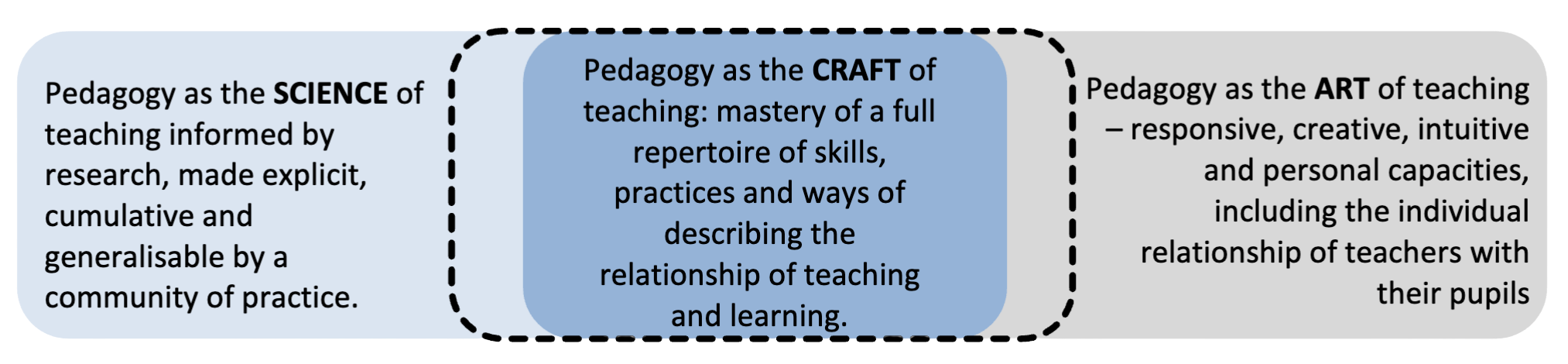Pedagogy as science refers to how forms of instruction are made explicit, coherent and generalisable through the learning sciences. Pedagogy as art refers to how teachers implement pedagogical approaches, strategies and tools intuitively and creatively, through contextualised personal responses and capacities. The interaction between these two ends comes together in the notion of ‘craft’, as a mastery of a repertoire of skills and practices - knowledge about practice and putting knowledge into practice. Pedagogy as craft stands in the interface between the learning sciences and idiosyncratic, contextualised teacher classroom practices; it encapsulates scientific knowledge in application and intuitive practice, informing professional judgements about approaches to teaching.
